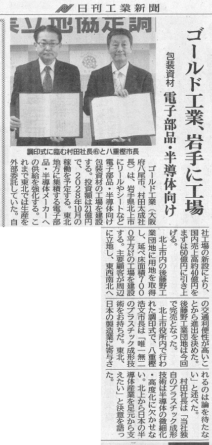 このたび、当社の岩手県への新工場進出計画が、日刊工業新聞に掲載されました。